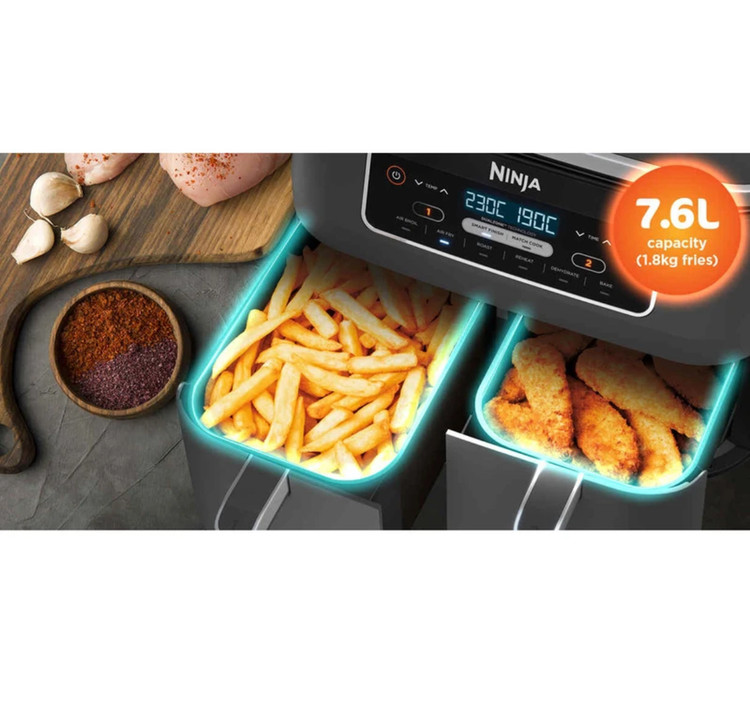 Dual zone:دو سبد مجزا برای پخت غذا, پخت 75 درصد سریع تر از فن های فردار, حالت stand by, عملکرد MAX CRISP:پخت سریع تر،داشتن غذای گرمتر و تردتر،با استفاده از دوسبد مجزا, قابلیت پخت 1.8 کیلوگرم سیب زمینی سرخ شده یا بال مرغ به صورت همزمان, مصرف 75 درصد چربی کمتر